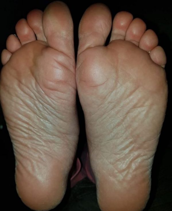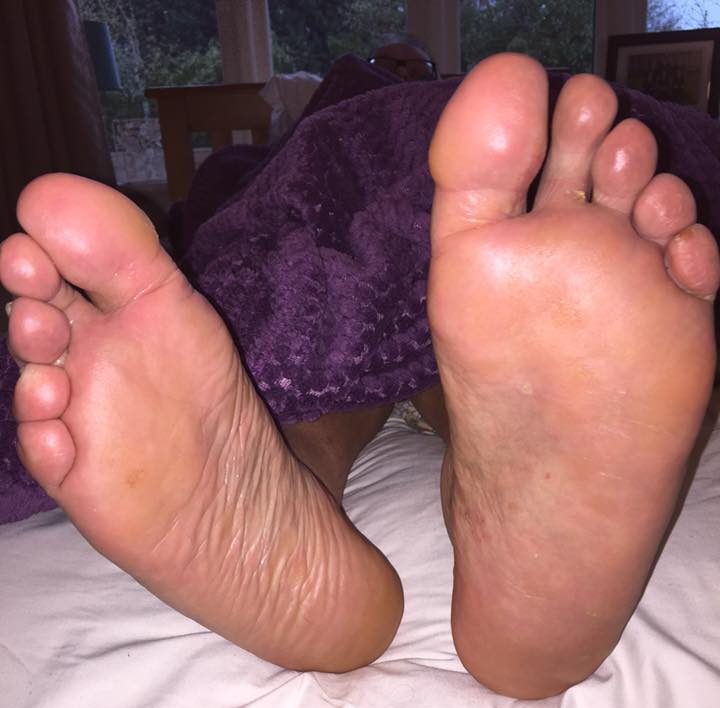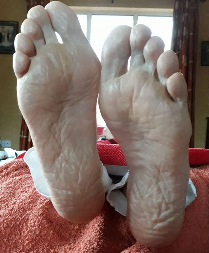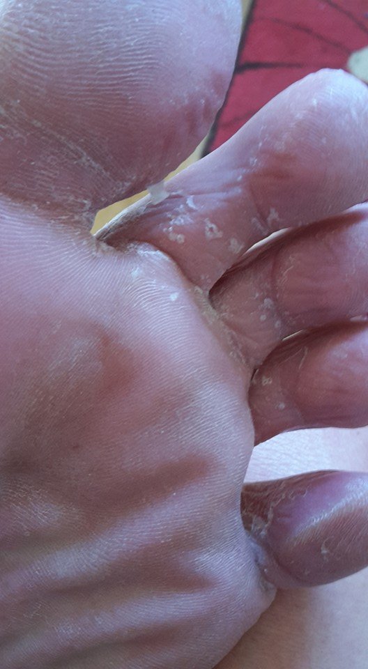 We can see a lot of peeling skin on the toes, which is athlete's foot caused by an overgrowth of the bacteria candida, and we should refer the client for a clinical diagnosis. However, they will likely be prescribed a topical fungal cream which may only keep the symptoms at bay.
